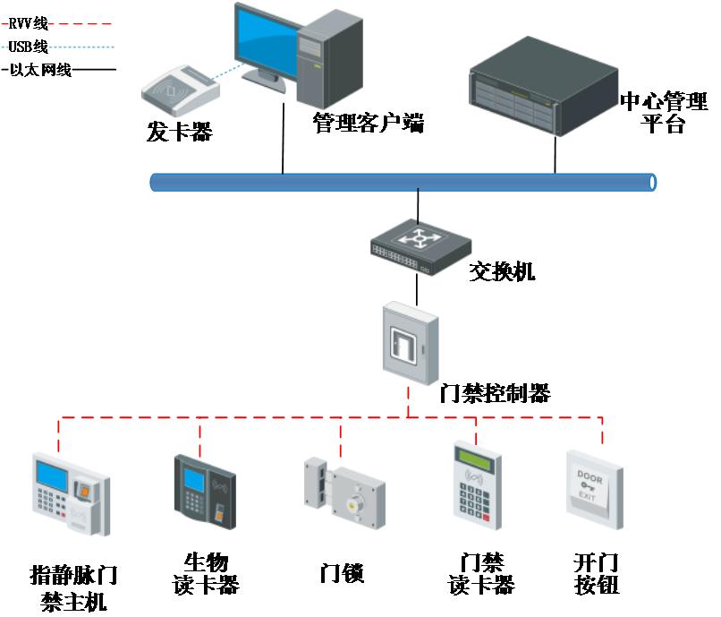 門禁讀卡器、生物識別讀卡器、開門按鈕、磁力鎖等前端門禁設備通過RVV4*0.75/ RVV2*0.75線纜接入到網絡門禁控制器上,而網絡門禁控制器通過非屏蔽雙絞線接入交換機經局域網集成到安防綜合管理平臺上。